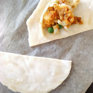 Zutaten & Zubereitung (Für ca 16 Samosa/für 2 Personen) Teig: - 125g Dinkelmehl (630) - ½ TL Salz - 50ml kaltes Wasser - 2 EL geschmacksneutrales Öl (z.b. Bratöl) Füllung: - 150g Kartoffeln - 40g Erbsen (TK aufgetaut oder aus dem Glas) - 40g Chicorée - kleine Zwiebel - 1 Knoblauchzehe - 1TL geriebene frischen Ingwer